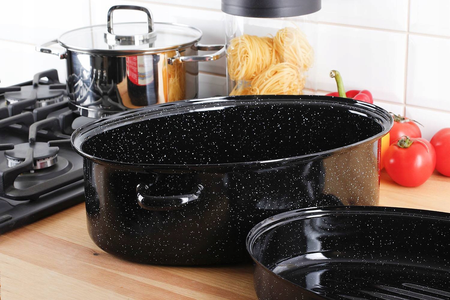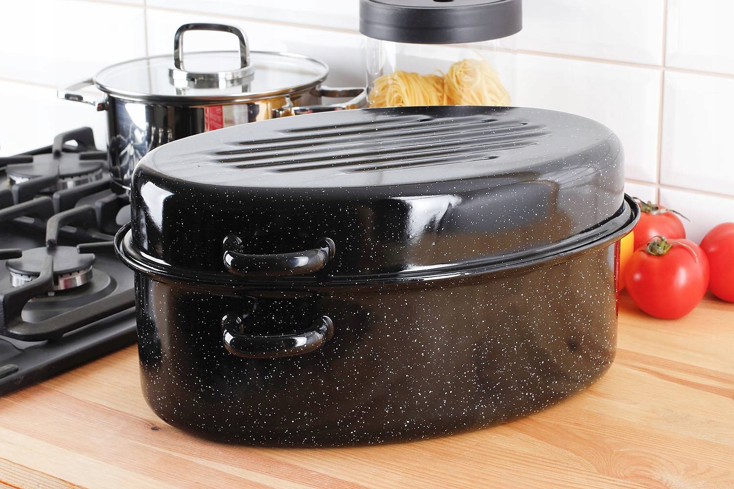 Brytfanna została pokryta czarną powłoką emaliowaną, dzięki której zyskała tradycyjny, a jednocześnie elegancki wygląd, a także cenne właściwości. Emaliowane naczynia są wykorzystywane w kuchni już od wielu lat! Niewątpliwą zaletą emalii jest to, że zapewnia gładką, higieniczną i antyalergiczną powierzchnię. Ponadto emalia jest wolna od szkodliwych substancji, dlatego brytfanna okaże się doskonałym naczyniem do przygotowywania posiłków dla alergików, dzieci i osób starszych. Powłoka nie wchodzi w żadne reakcje z żywnością, a dodatkowo jest bardzo łatwa w czyszczeniu. Z gładkiej powierzchni bez problemu usuniesz wszystkie zabrudzenia.