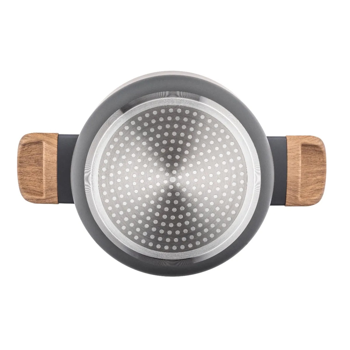 Powłoka non-stick Ombre to idealne połączenie zaawansowanej technologii z unikalnym wzornictwem. Jej charakterystyczne, eleganckie cieniowanie nadaje naczyniom niepowtarzalny wygląd i sprawia, że wyróżniają się w każdej kuchni. Gładka, nieprzywierająca powierzchnia umożliwia gotowanie z minimalną ilością tłuszczu – bez ryzyka przypaleń czy trudnych do usunięcia resztek. Dodatkowo, powłoka charakteryzuje się wysoką odpornością na zarysowania i uszkodzenia mechaniczne, co gwarantuje trwałość oraz łatwe utrzymanie w czystości. Co najważniejsze – jest bezpieczna dla zdrowia, nie zawiera PFOA, PFOS ani metali ciężkich.