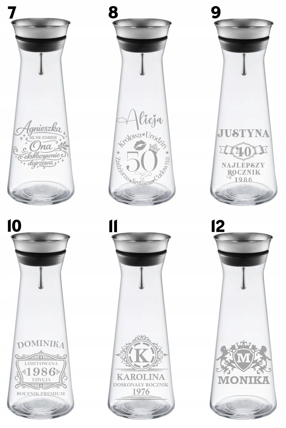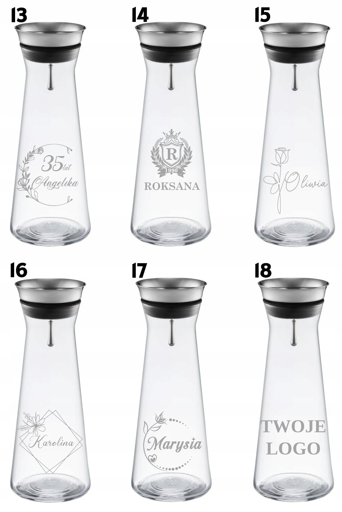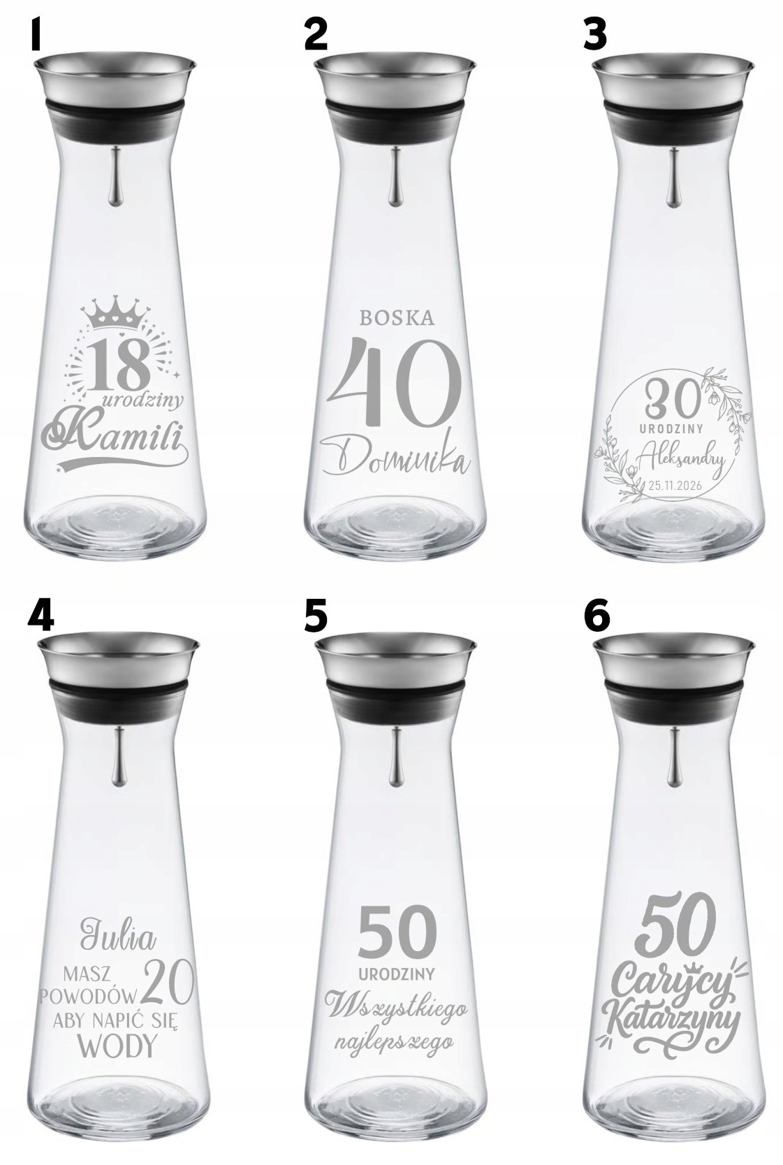 Największym atutem karafki jest możliwość personalizacji grawerem – możesz wybrać gotowy wzór i dodać własne imię oraz datę (np. urodziny, rocznicę), albo zdecydować się na indywidualny projekt – własny napis, dedykację lub logo firmy. Dzięki temu karafka świetnie sprawdzi się zarówno jako prezent prywatny, jak i elegancki upominek biznesowy.