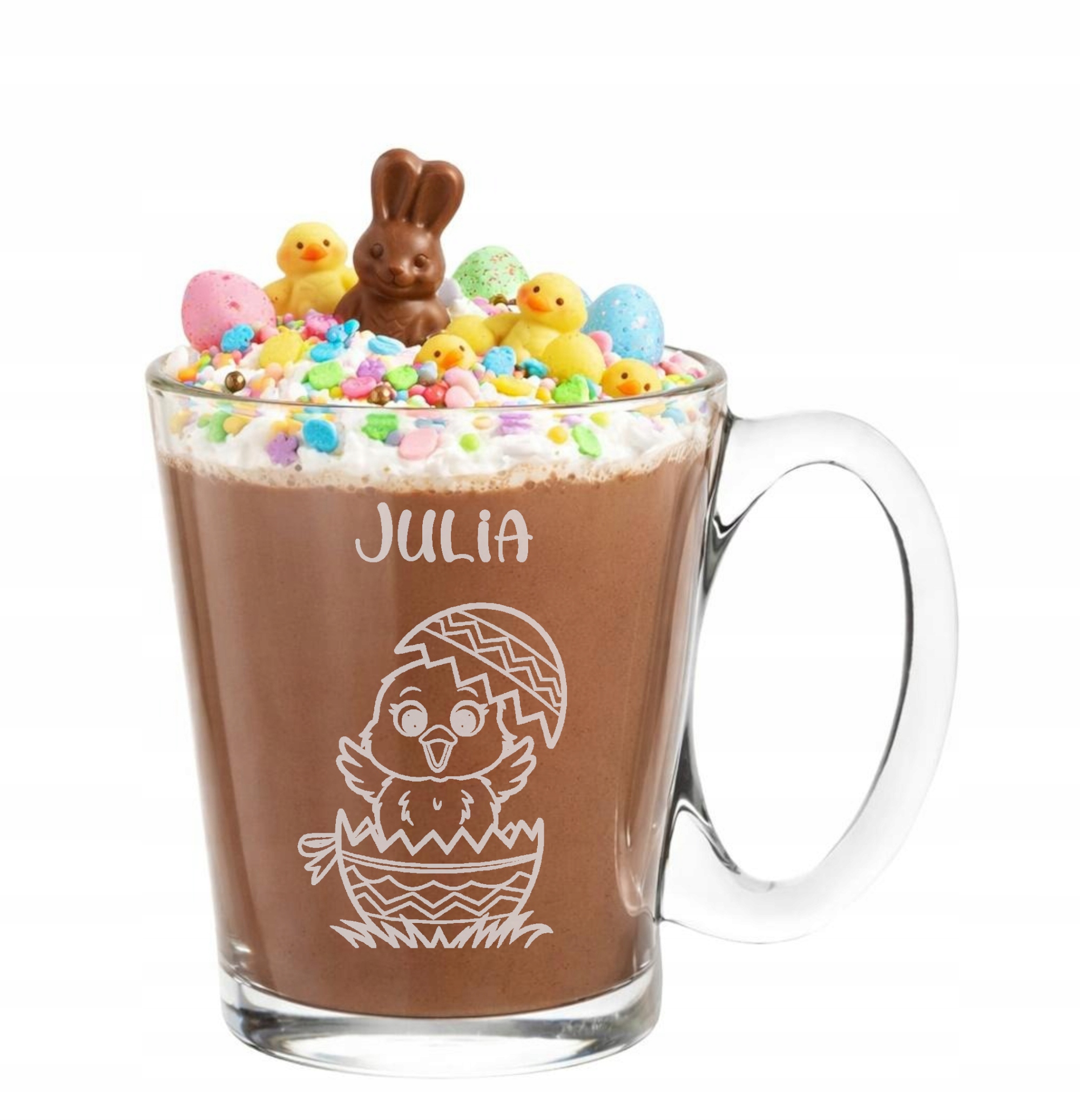 Idealny do ciepłych napojów Doskonały do kakao, gorącej czekolady, herbaty lub mleka. Wysokiej jakości szkło jest przyjemne w użytkowaniu i odporne na mycie w zmywarce, a trwały grawer zachowuje swój wygląd przez lata.