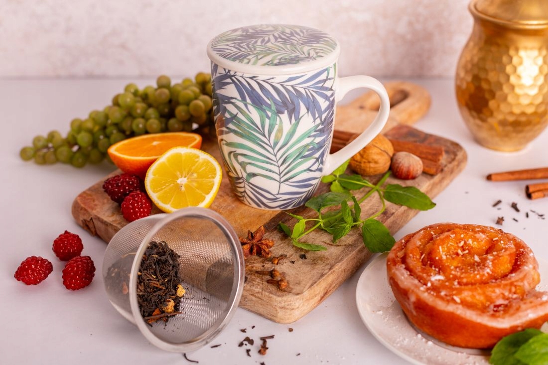 Kubek z metalowym zaparzaczem i pokrywką Liście, wchodzący w skład kolekcji Kwiaty, wykonany z porcelany New Bone China, charakteryzującej się elegancką i naturalną kremowo - białą barwą z delikatnym połyskiem a także wyjątkową wytrzymałością przy zachowaniu lekkości i delikatności. Doskonały do przyrządzania ulubionych ziół i aromatycznej herbaty.