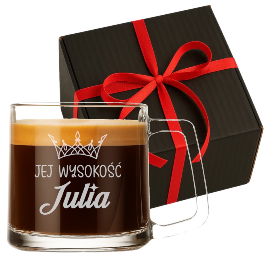 Kubek wykonany jest z hartowanego szkła, odpornego na zarysowania i stłuczenia. Krystaliczna przejrzystość pięknie eksponuje trwały grawer, a klasyczny, minimalistyczny design pasuje do każdego wnętrza.