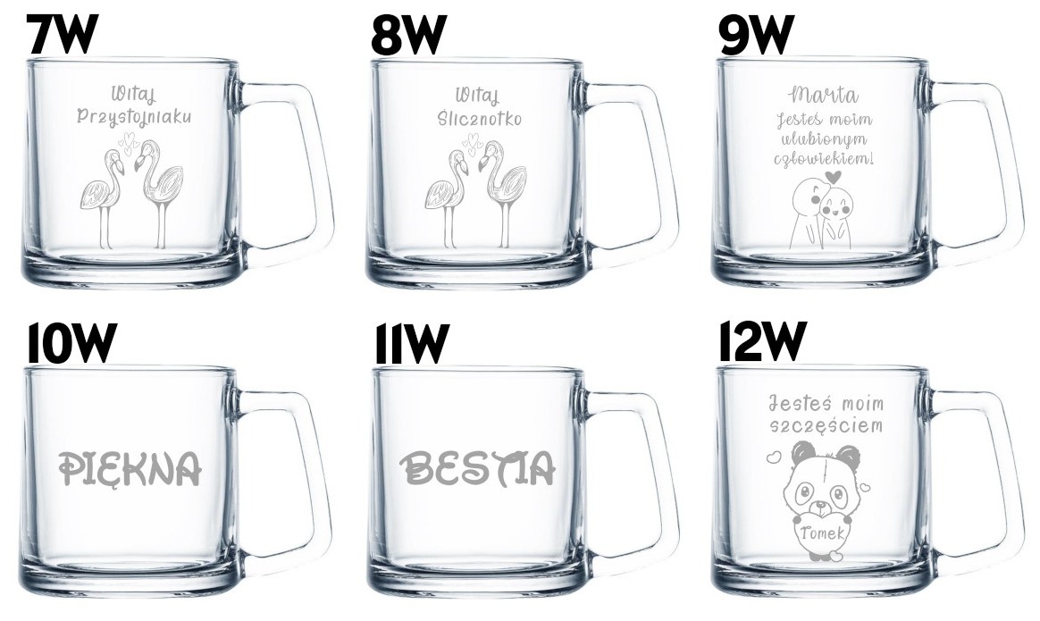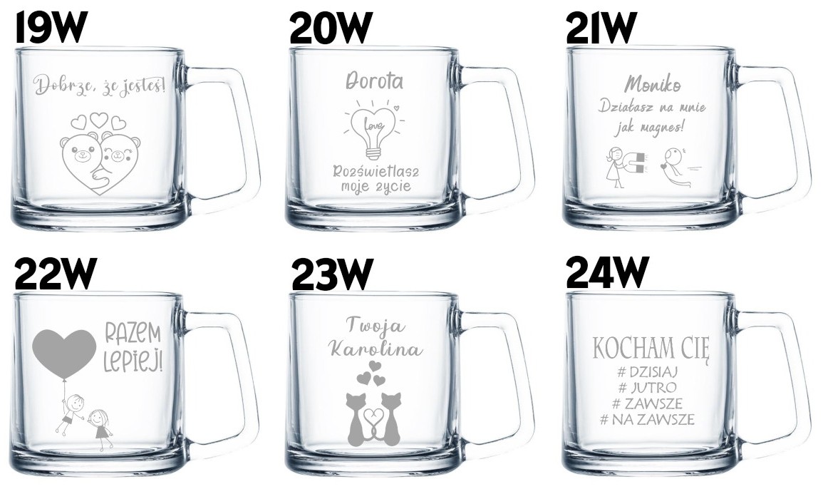Kubek wykonany jest z hartowanego szkła, odpornego na zarysowania i stłuczenia. Krystaliczna przejrzystość pięknie eksponuje trwały grawer, a klasyczny, minimalistyczny design pasuje do każdego wnętrza.
