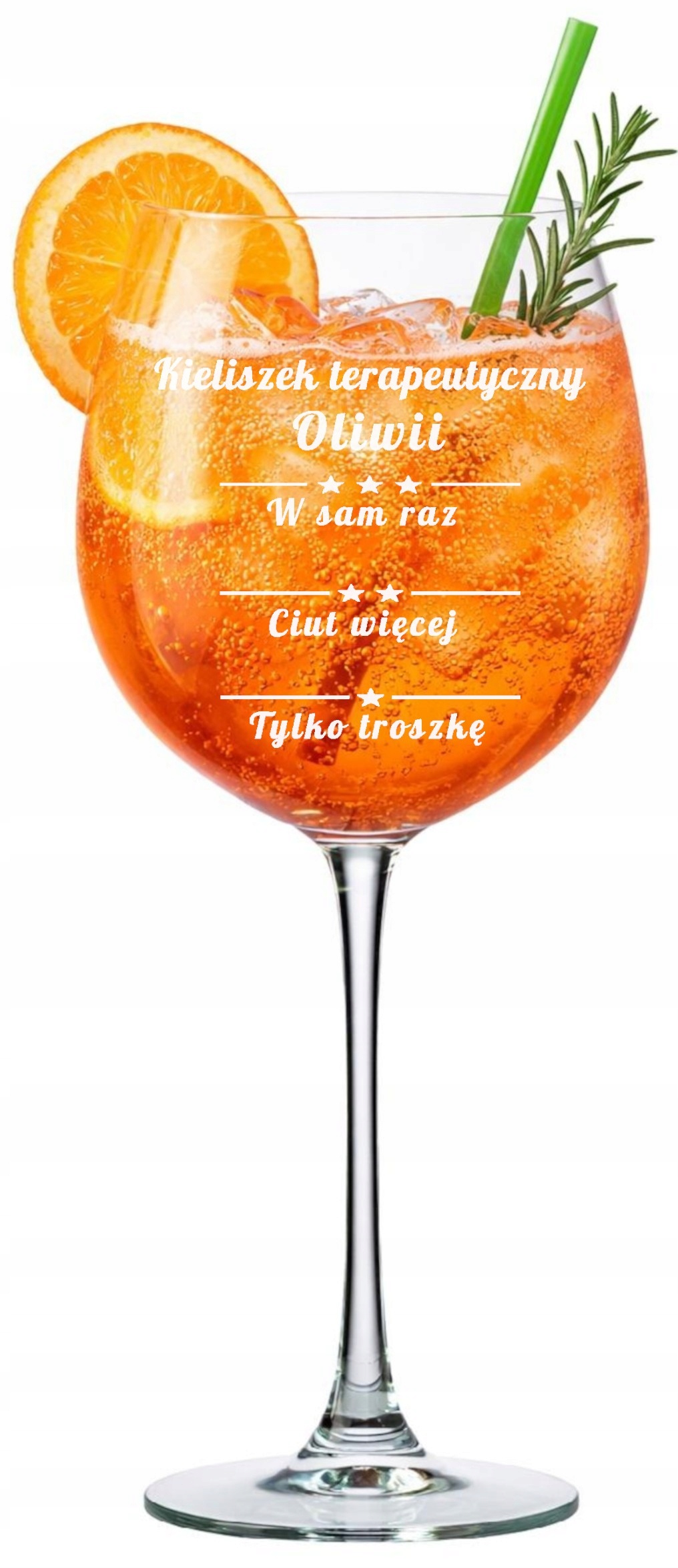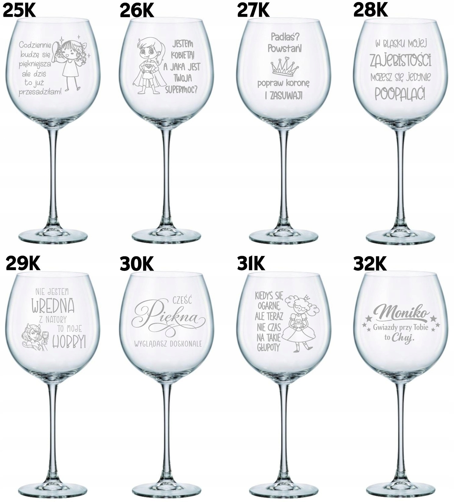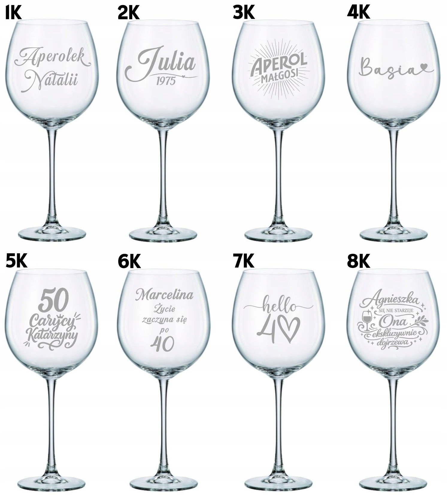 Wśród popularnych projektów znajdują się m.in. „Kieliszek Terapeutyczny”, zabawny „Aperolek” czy elegancki wzór „Ona się nie starzeje” – idealny na urodziny, jubileusz lub wieczór panieński.
