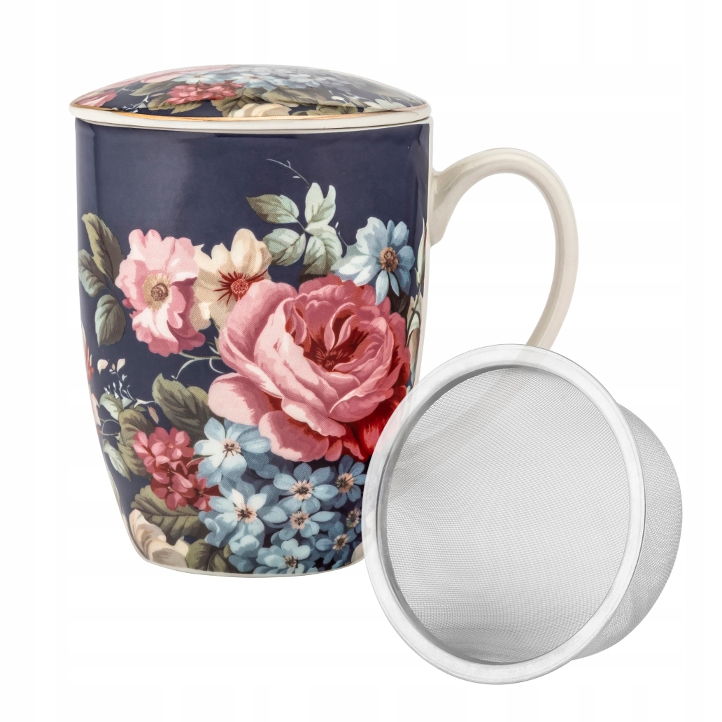 Kubek porcelanowy z zaparzaczem i pokrywką Kwiaty Róża Granatowy 350 ml