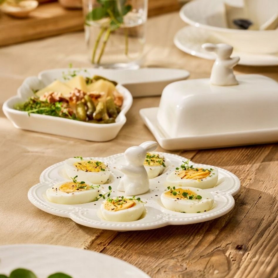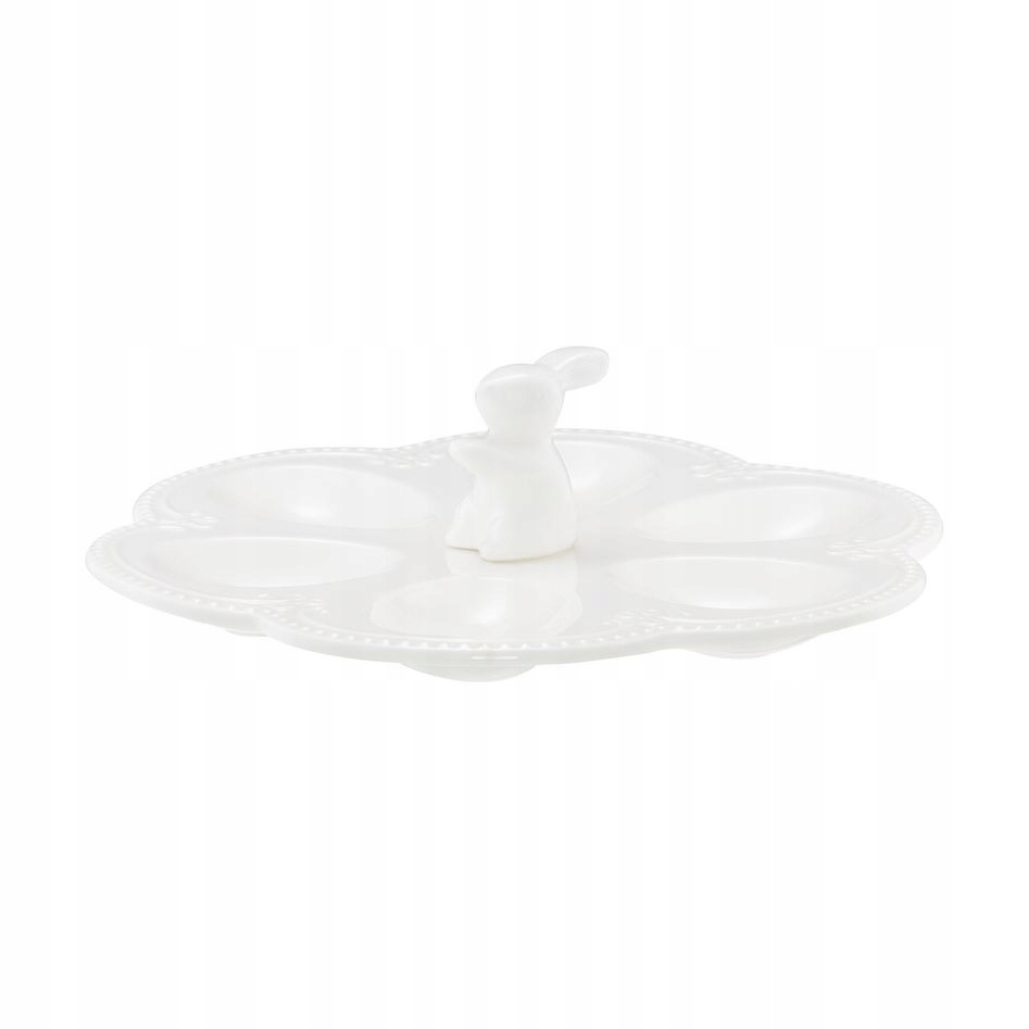 Porcelanowy półmisek do serwowania jajek to praktyczny i dekoracyjny element zastawy stołowej, który doskonale sprawdzi się podczas śniadań, spotkań rodzinnych oraz wielkanocnych uroczystości. Wykonany z wysokiej jakości porcelany, wyróżnia się trwałością oraz eleganckim, gładkim wykończeniem. Specjalnie wyprofilowane wgłębienia umożliwiają stabilne ułożenie jajek, co ułatwia estetyczne podanie potraw. Centralnie umieszczona figurka zajączka nadaje całości wyjątkowego, sezonowego charakteru i przyciąga wzrok gości. Jasna kolorystyka sprawia, że talerz harmonijnie komponuje się z klasyczną i nowoczesną zastawą.