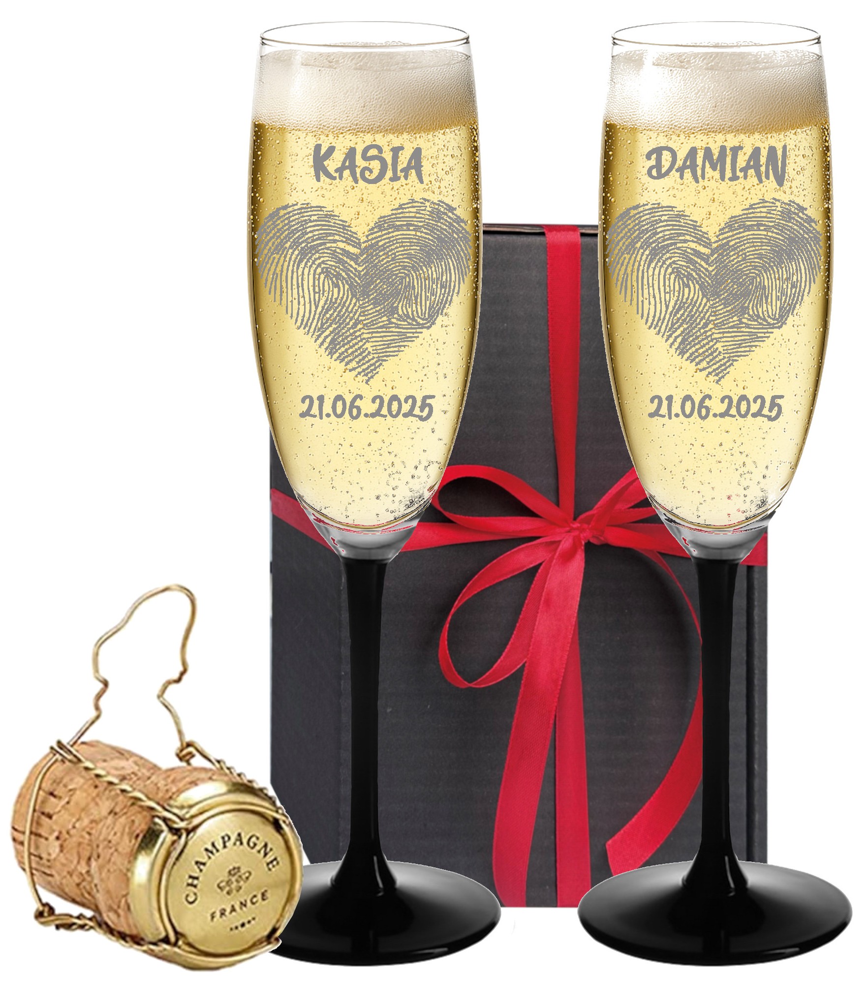Kieliszki do szampana z czarną nóżką GRAWER Para Młoda panieński PREZENT