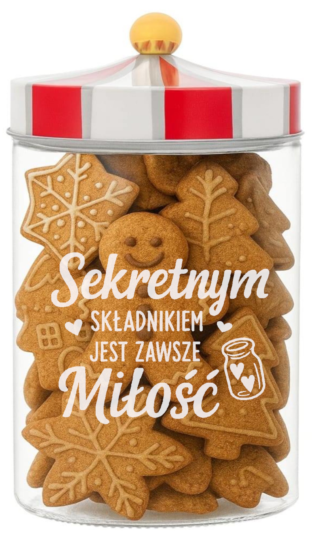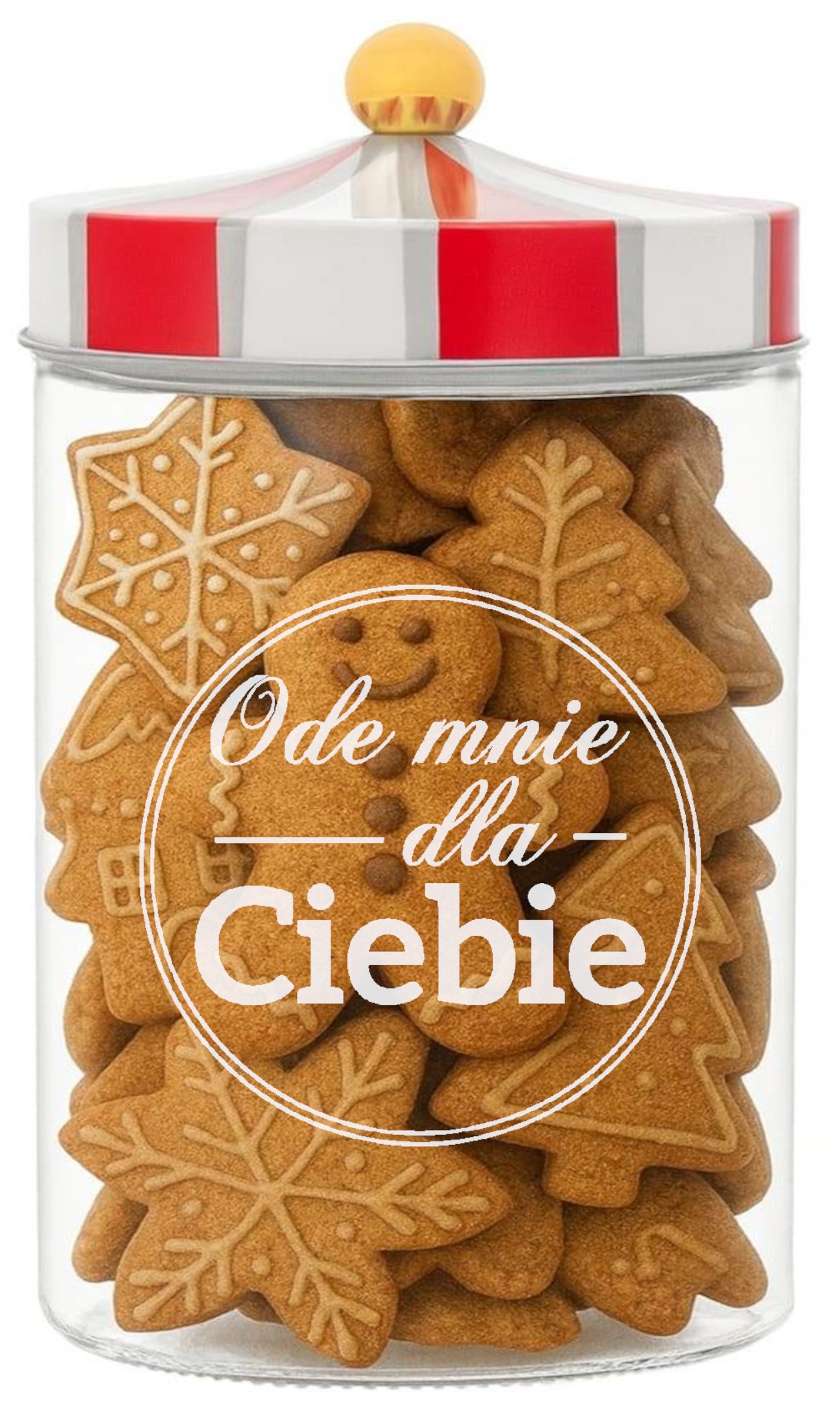 Dzięki personalizowanemu grawerowi z imieniem lub dedykacją pojemnik staje się niepowtarzalnym akcentem na świątecznym stole – a także pięknym prezentem dla bliskiej osoby. Transparentne szkło pięknie eksponuje zawartość, a pokrywka w świątecznych kolorach czerwieni i bieli, inspirowana karuzelą bożonarodzeniową, wprowadza radość, ciepło i odrobinę dziecięcej beztroski.