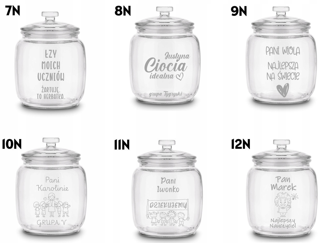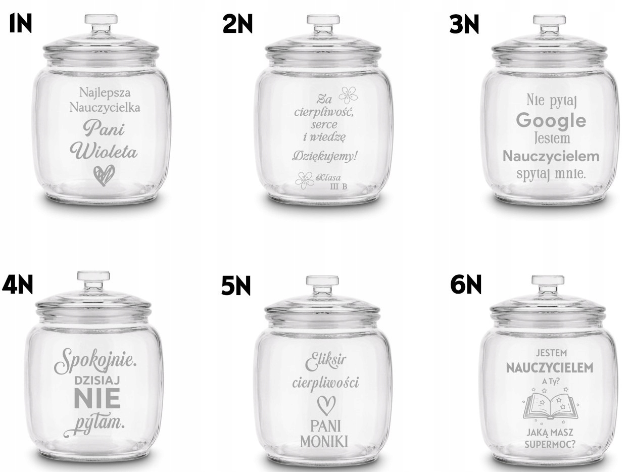 ✔️ Personalizowany grawer – wyjątkowy akcent Zamień zwykły słoik w niezapomnianą pamiątkę! Dzięki grawerowi możesz dodać imię nauczyciela, dedykację, a nawet własny wzór. Do wyboru przygotowaliśmy gotowe projekty, ale możesz też utworzyć swój tekst lub grafikę – efekt będzie unikalny i niepowtarzalny.