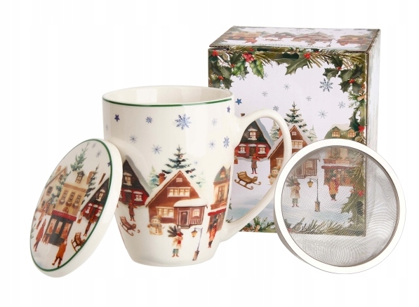 Kubek z zaparzaczem CHRISTMAS VILLAGE wchodzący w skład serii Świątecznej, wykonany z porcelany New Bone China, która charakteryzuje się naturalnym kremowo-białym kolorem z delikatnym połyskiem oraz wyjątkową wytrzymałością i trwałością, zachowując lekkość i finezję.