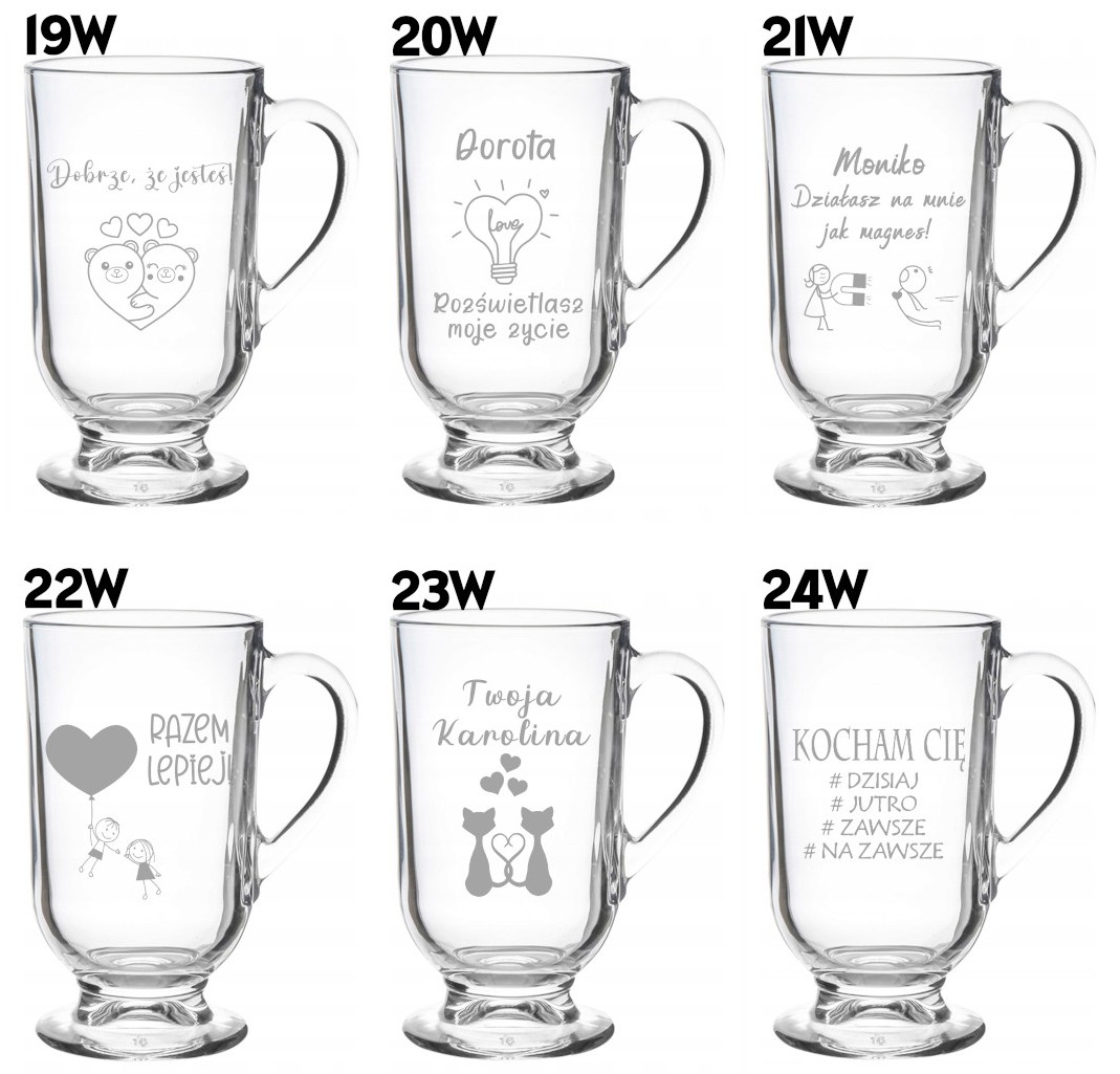 Największą wartością tej szklanki jest indywidualny grawer. Wygrawerujemy imię, romantyczną dedykację, ważną datę, krótki cytat o miłości, delikatny symbol serca lub własną grafikę. Do wyboru są zarówno gotowe, walentynkowe wzory graweru, jak i pełna personalizacja. Dzięki temu każda szklanka staje się niepowtarzalnym prezentem z prawdziwym przesłaniem.