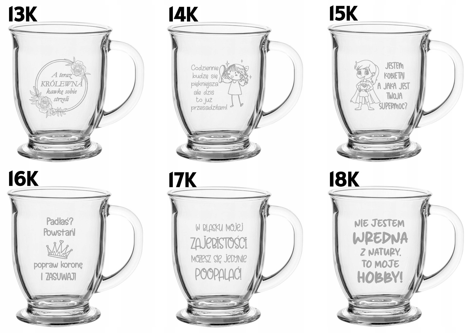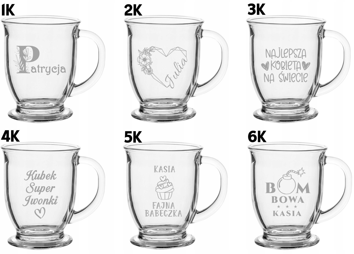 Wizualizacje graweru są poglądowe – w rzeczywistości grawer jest trwałym wyżłobieniem w szkle, a nie białym nadrukiem.