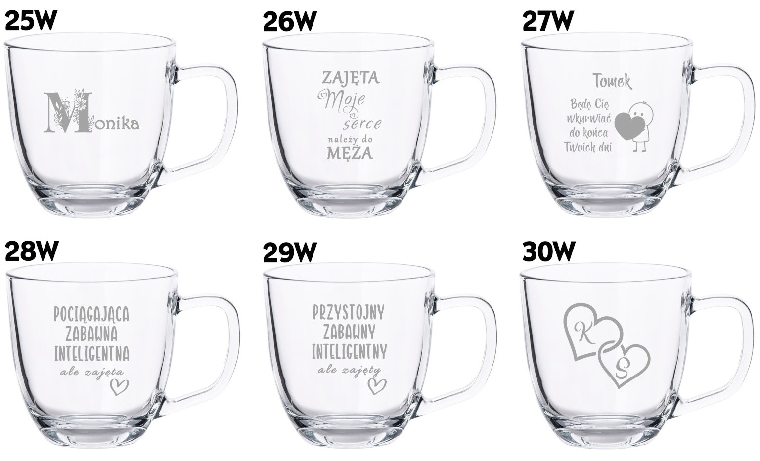 Istnieje możliwość wykonania graweru po prawej lub lewej stronie kubka – zgodnie z preferencją osoby trzymającej szklankę w dłoni.