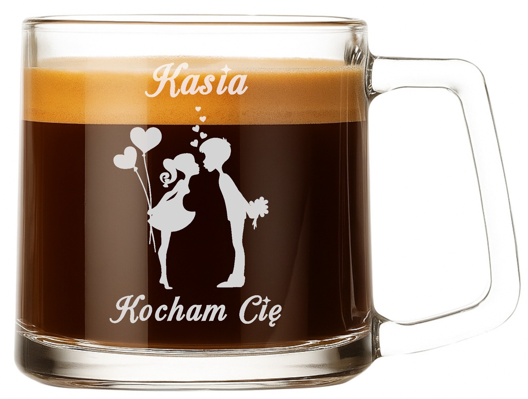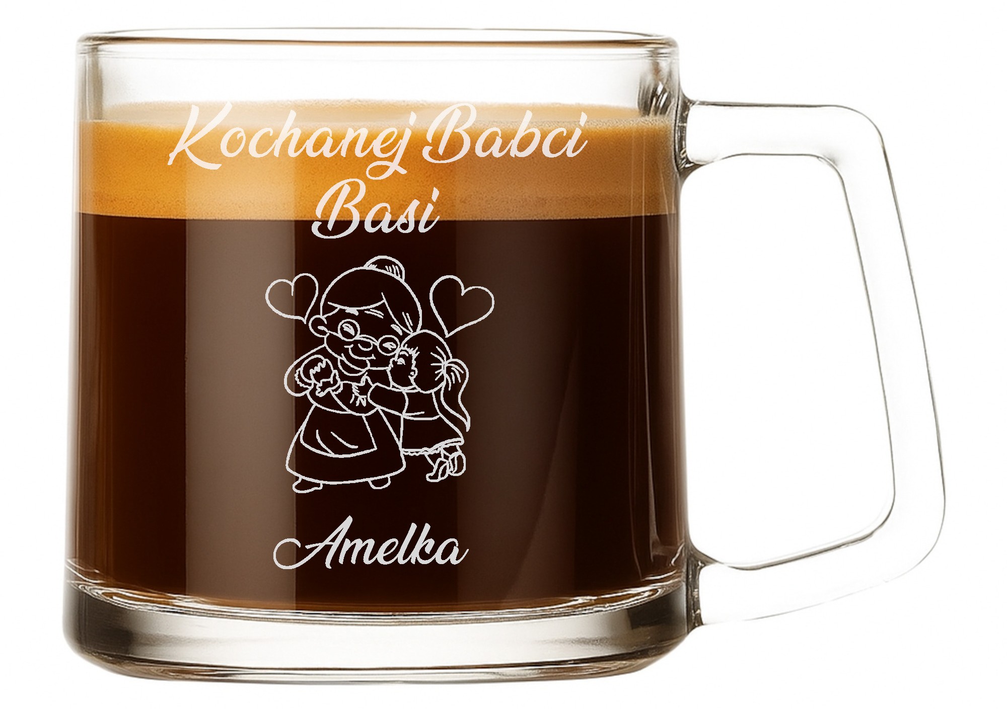 Kubek wykonany jest z wysokiej jakości szkła, odpornego na zarysowania i stłuczenia, a jego krystaliczna przejrzystość pięknie eksponuje precyzyjny grawer. Klasyczny, minimalistyczny design sprawia, że doskonale pasuje do każdej kuchni, sypialni czy biura – zawsze blisko serca.