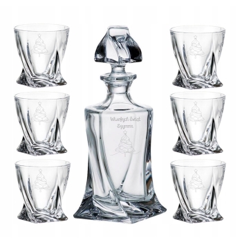 Zestaw ozdabiony jest delikatnym, artystycznym grawerem, który nie tylko podkreśla piękno tego nowoczesnego kryształu, ale również czyni je idealnym pomysłem na prezent z okazji Świąt Bożego Narodzenia. Szklanki i karafka będą zdobić świąteczny stół oraz sprzyjać rodzinnym rozmowom i celebracji czasu wśród najbliższych.