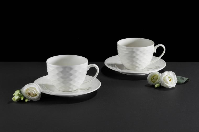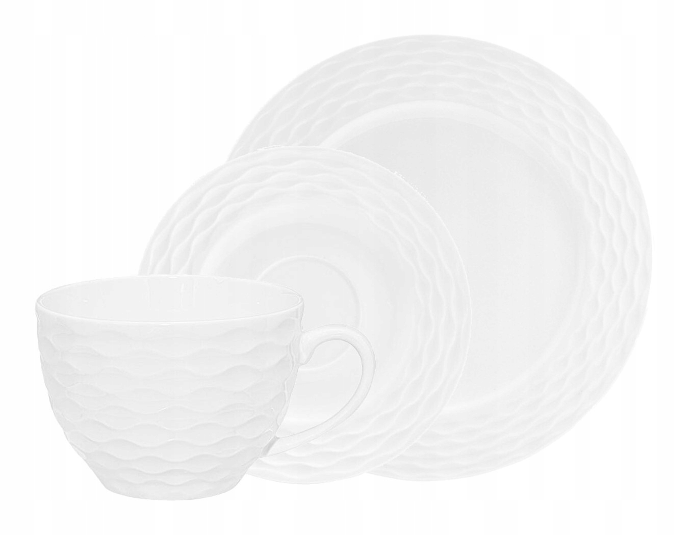Klasyczna biała porcelana z delikatnym tłoczeniem prezentuje się bardzo elegancko na stole i łatwo dopasowuje się do innych elementów zastawy. Zestaw pozwala wygodnie podać kawę, herbatę oraz deser w spójnej i estetycznej formie.